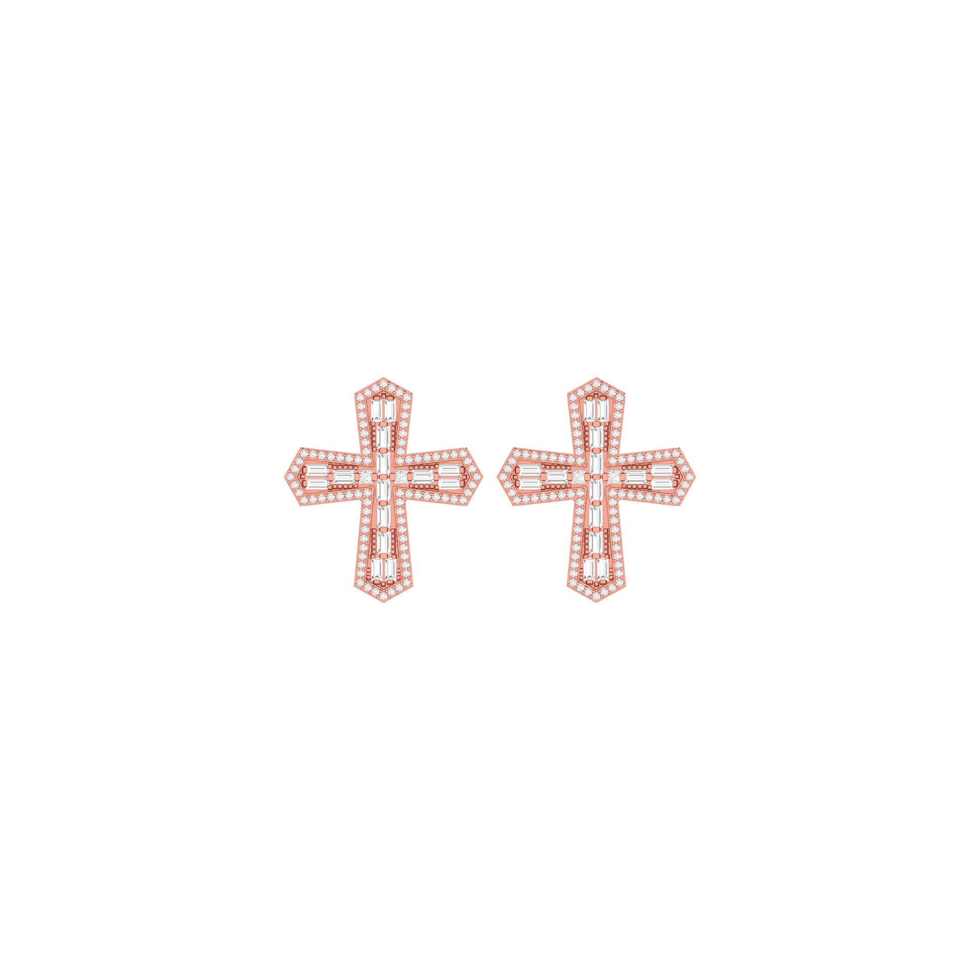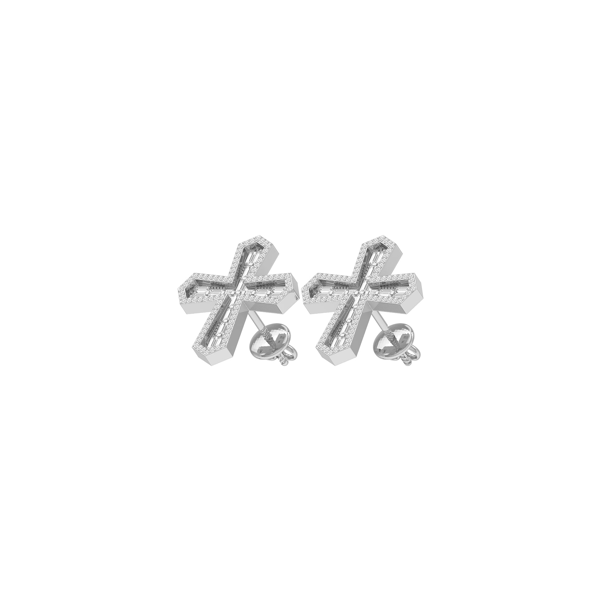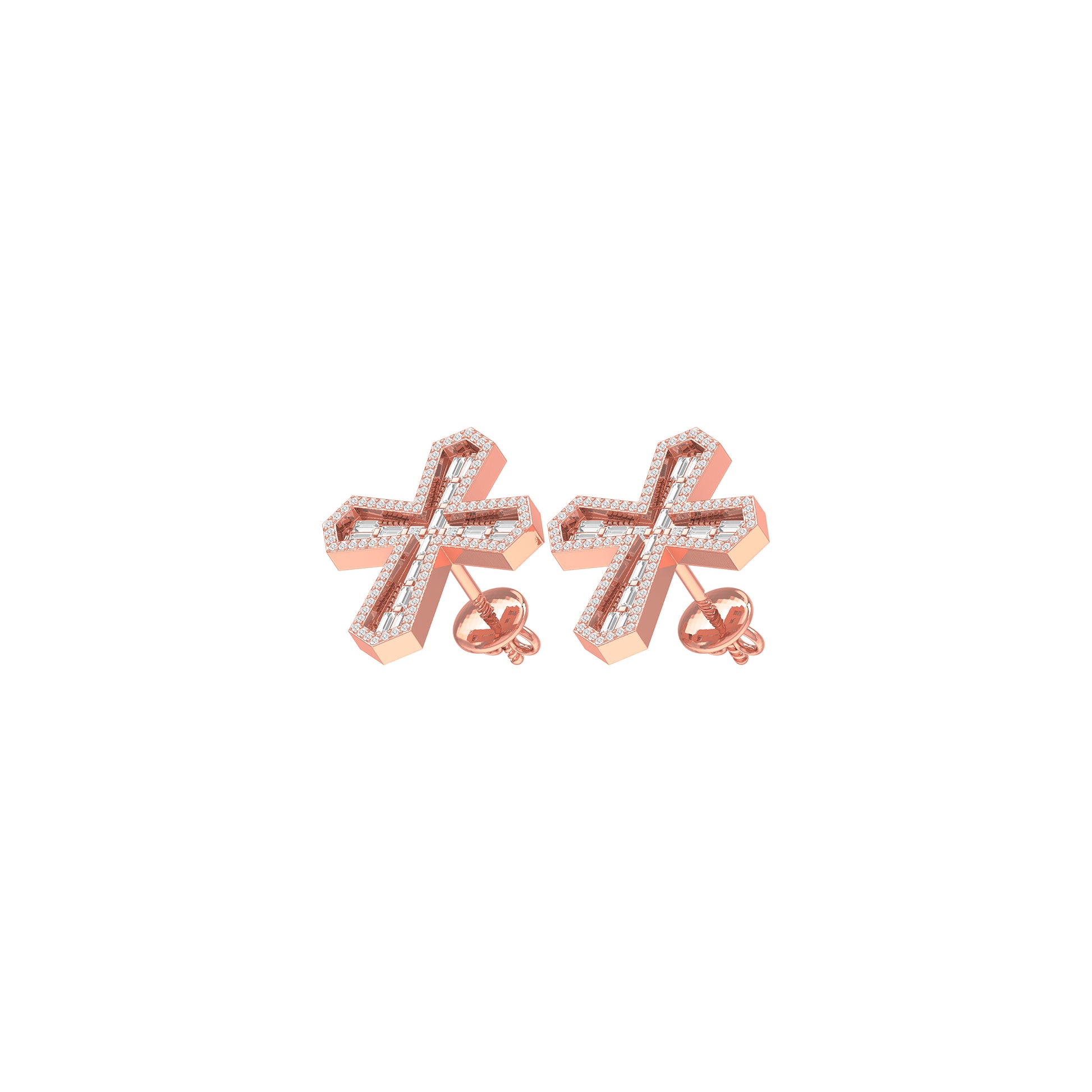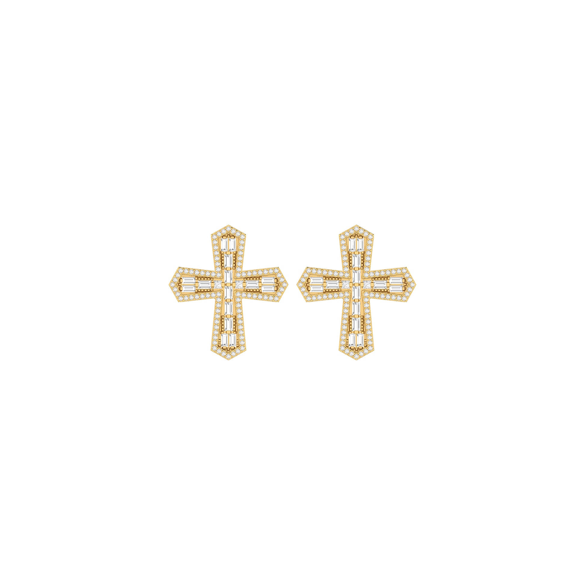 Yellow Gold Round and Baguette Diamond Cross Stud Earrings