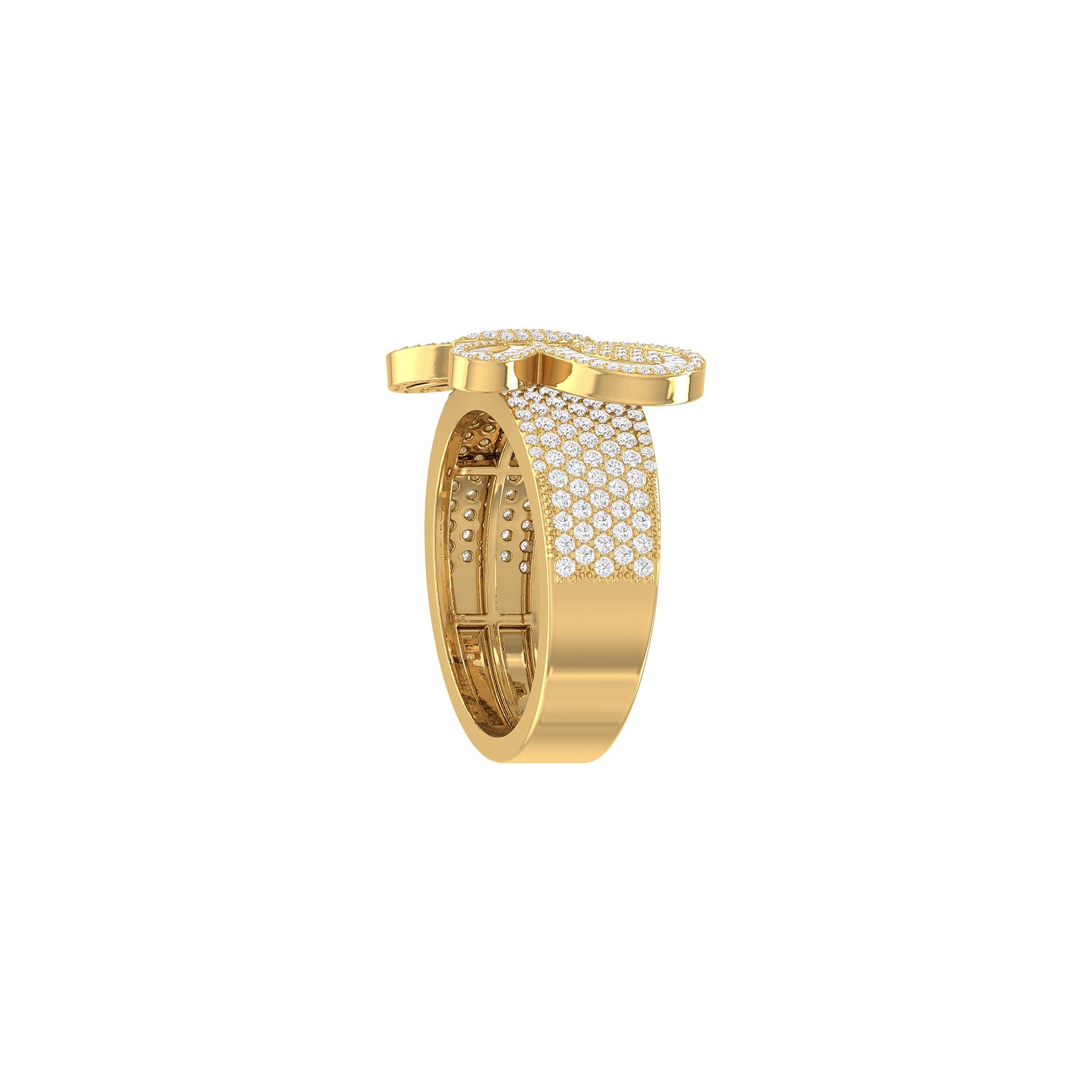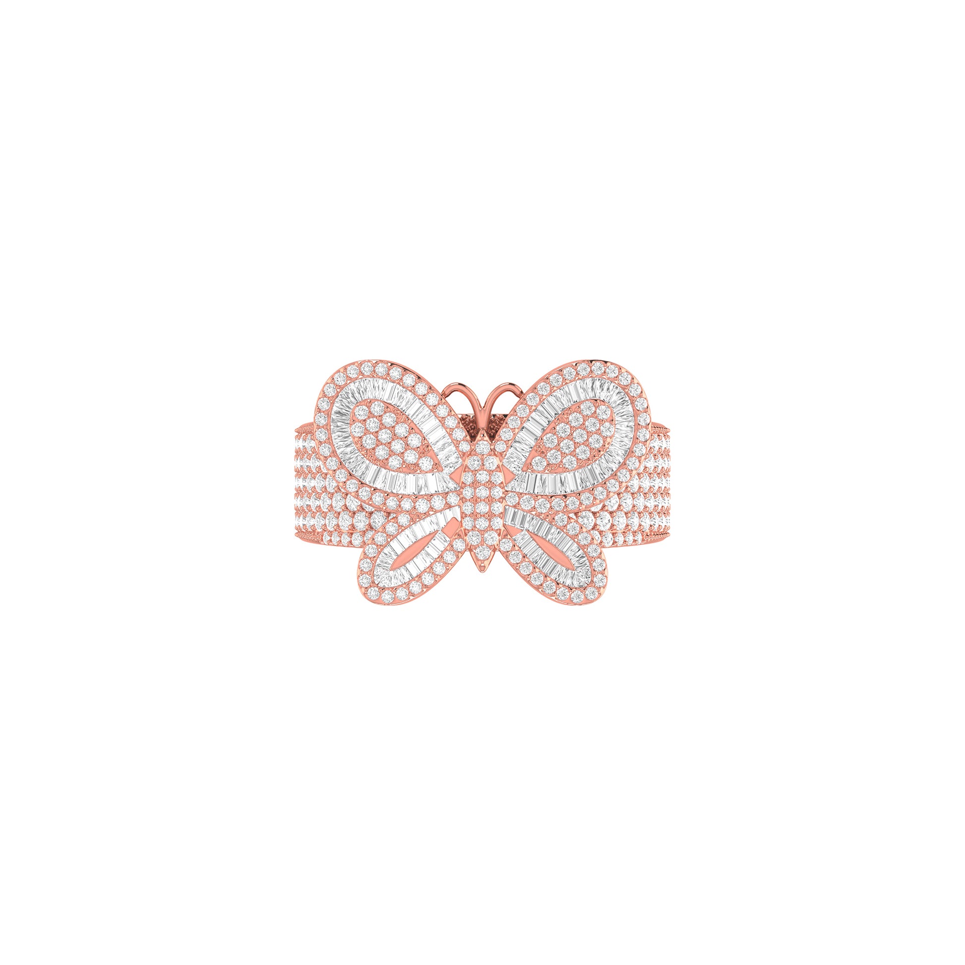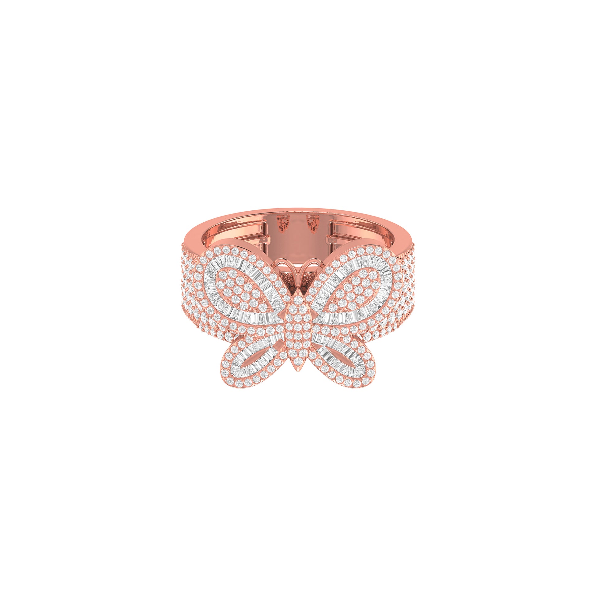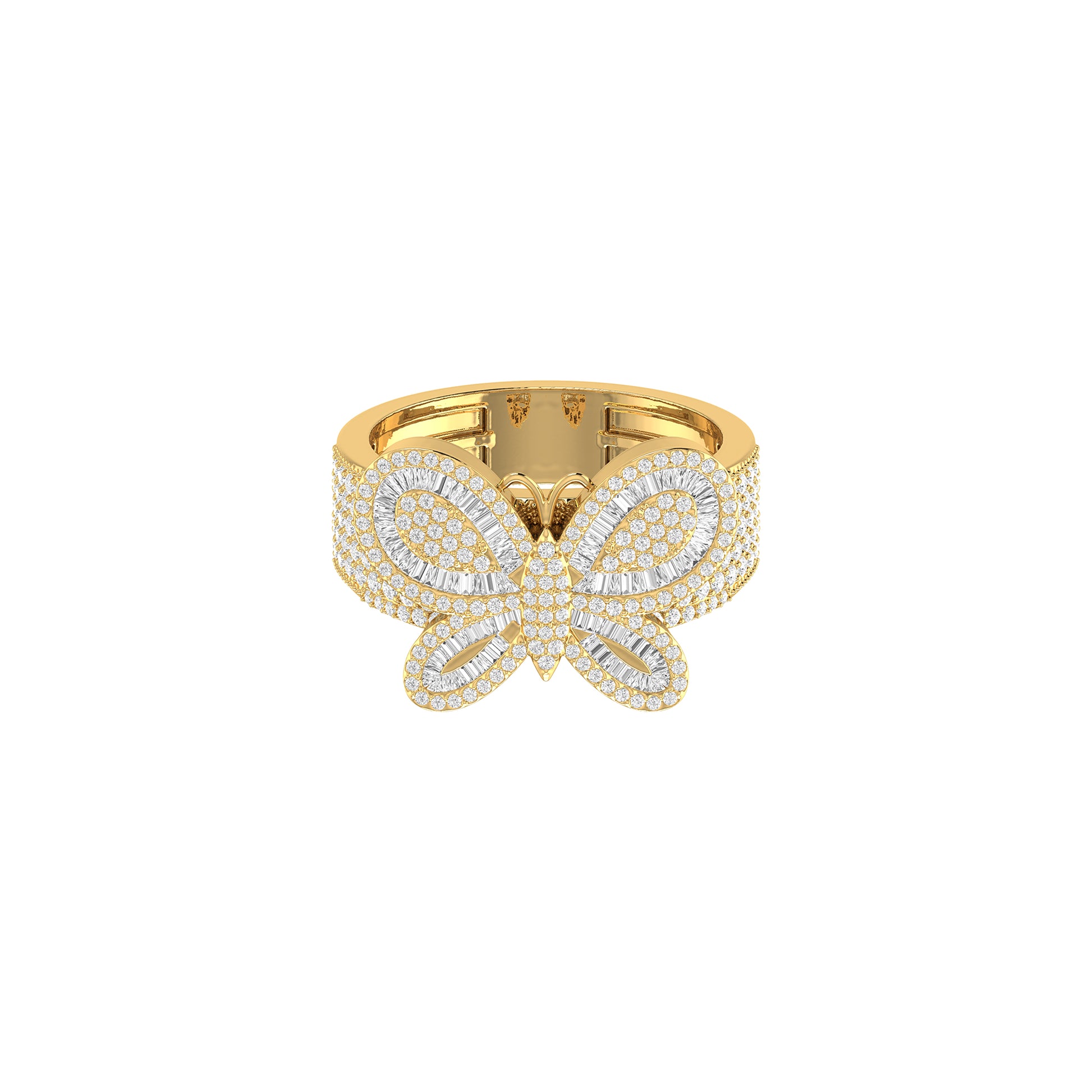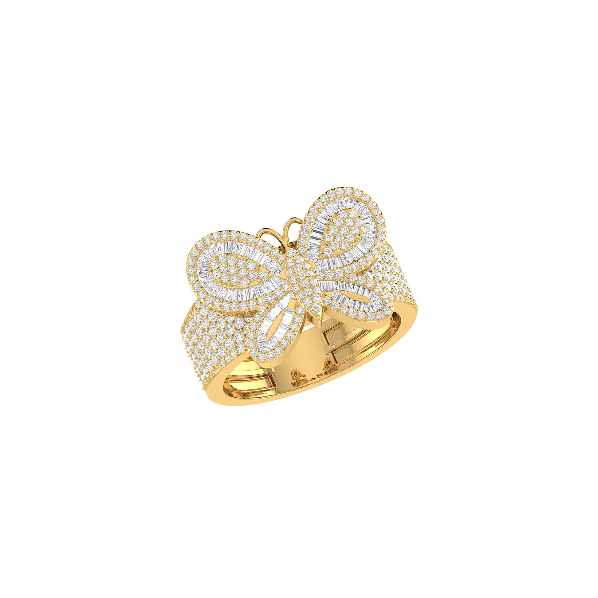 Discover the enchanting Yellow Gold Baguette and Round Diamond Butterfly Ring. Adorned with meticulously set baguette and round diamonds in a delicate butterfly design, this ring sparkles with sophistication. Perfect for adding a touch of whimsical elegance to any look, it's an ideal gift for her, symbolizing transformation and beauty. A standout piece crafted for lasting impressions